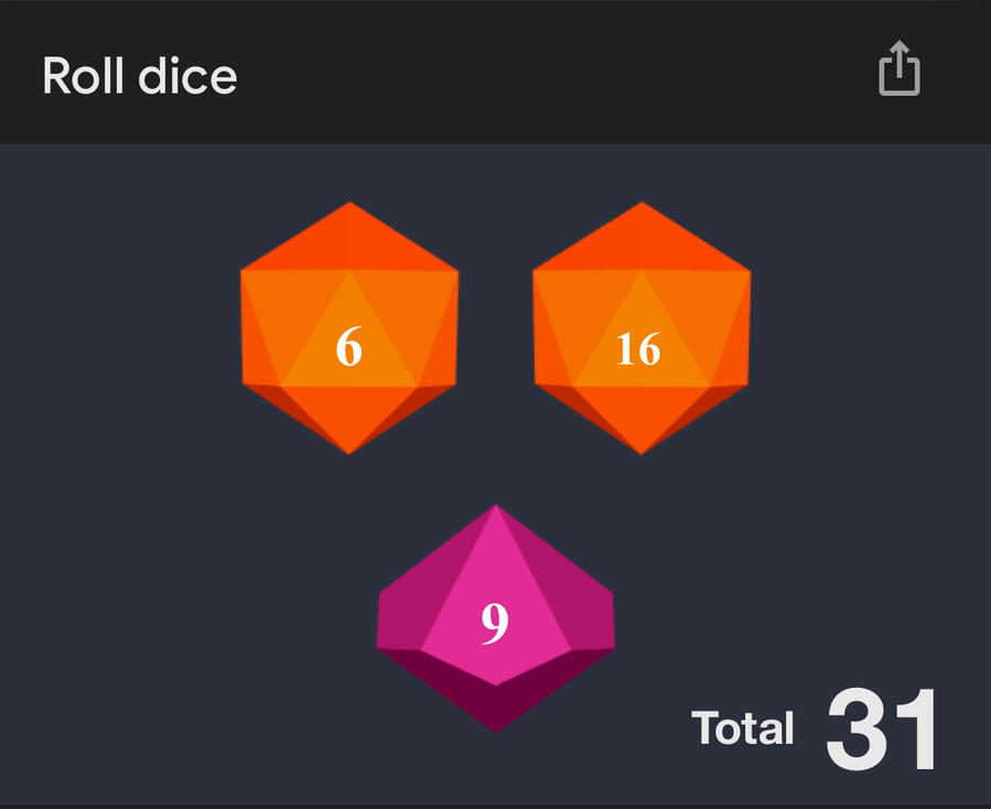 Dadu yang digunakan adalah dadu dari Google Dice yang bersisi 20 (2 dadu) dan 10 (1 dadu). Contoh terlampir.
